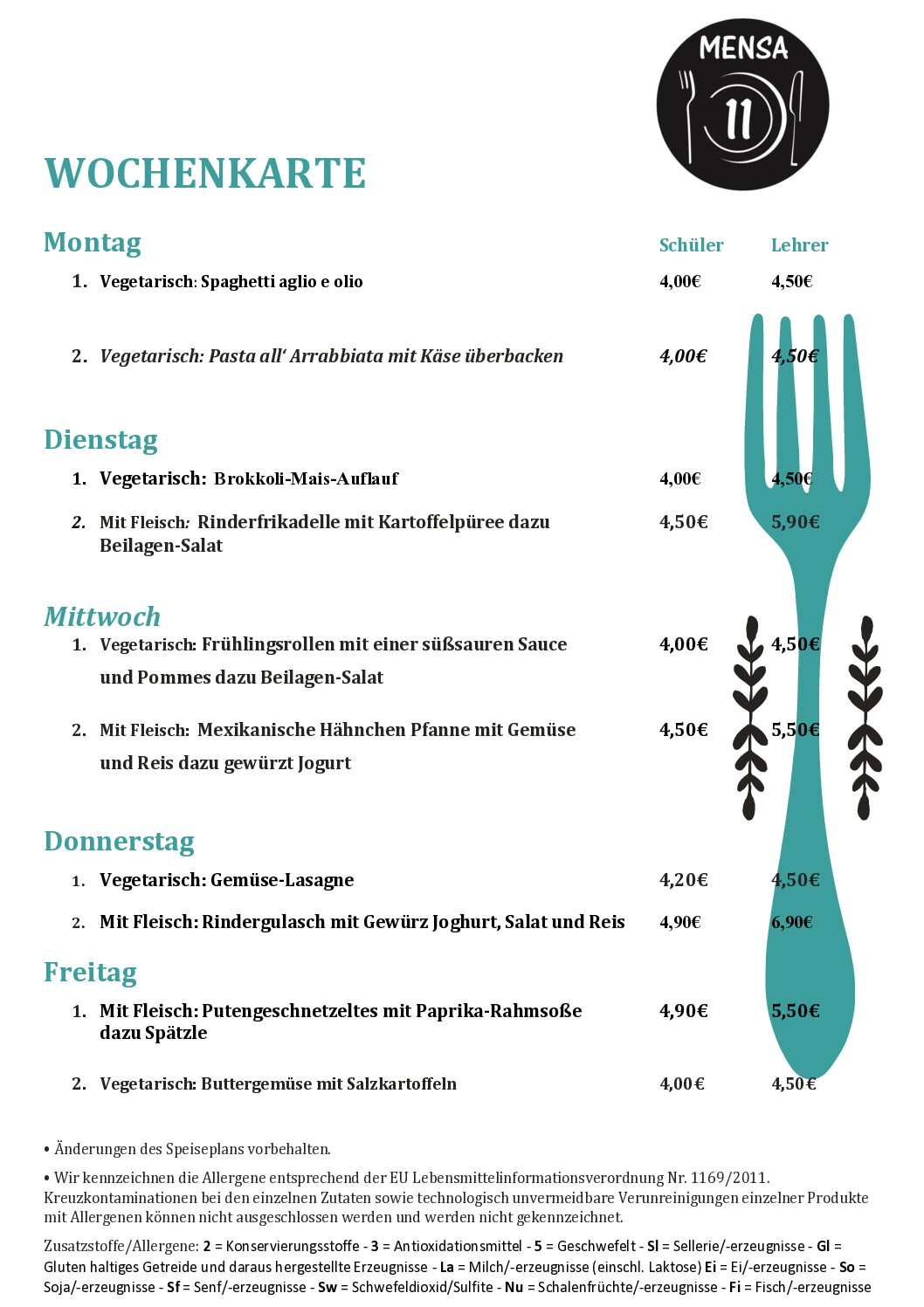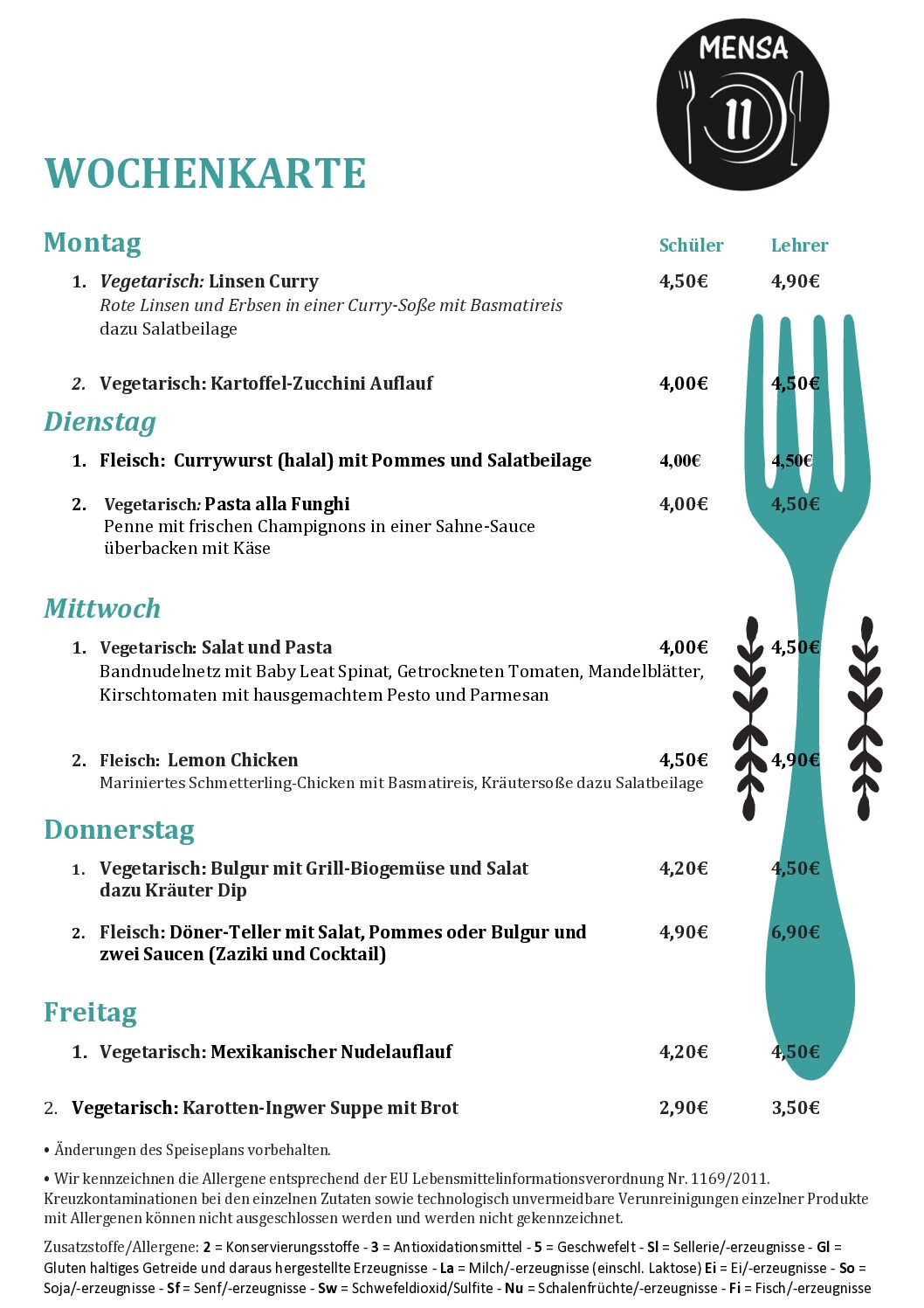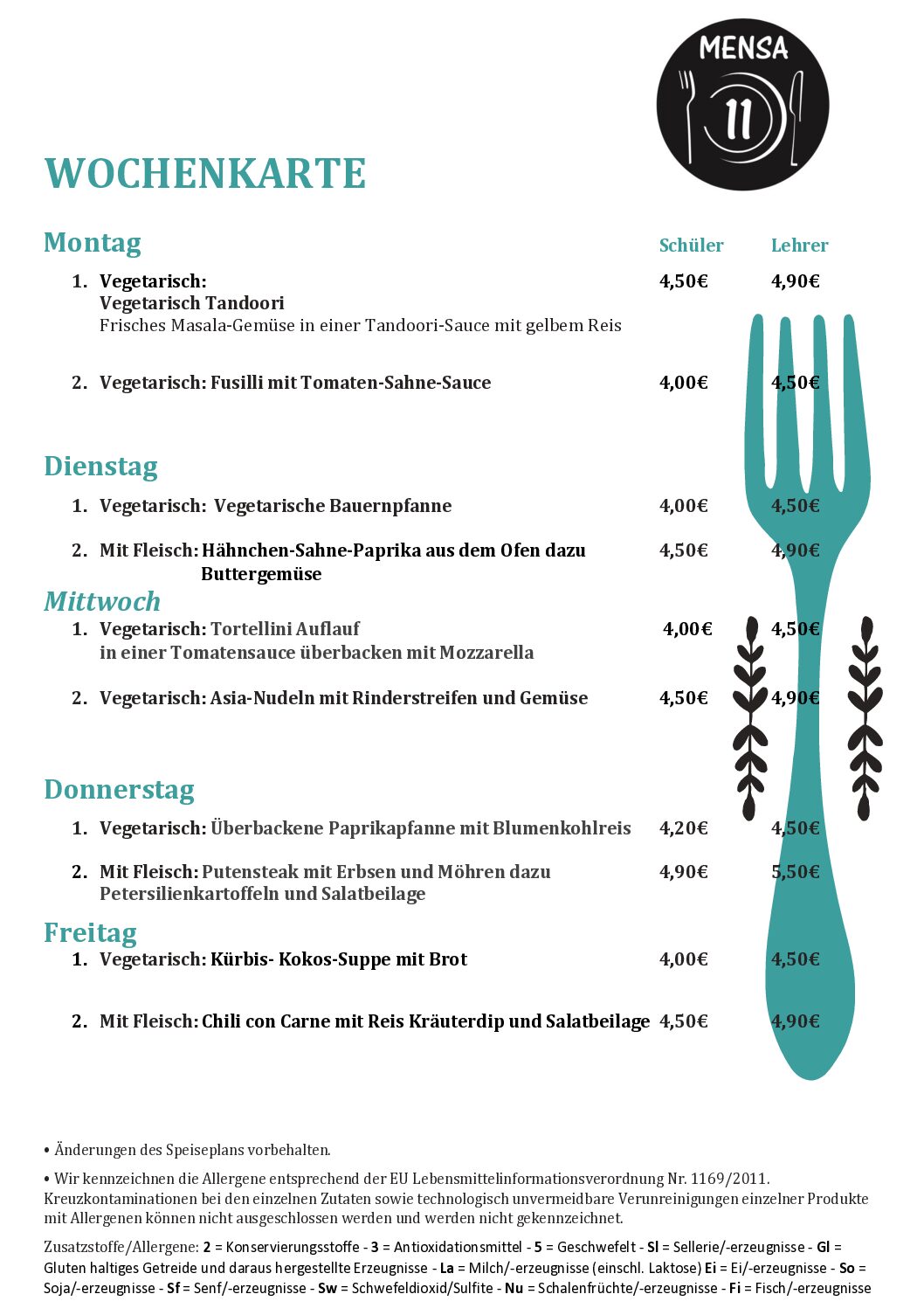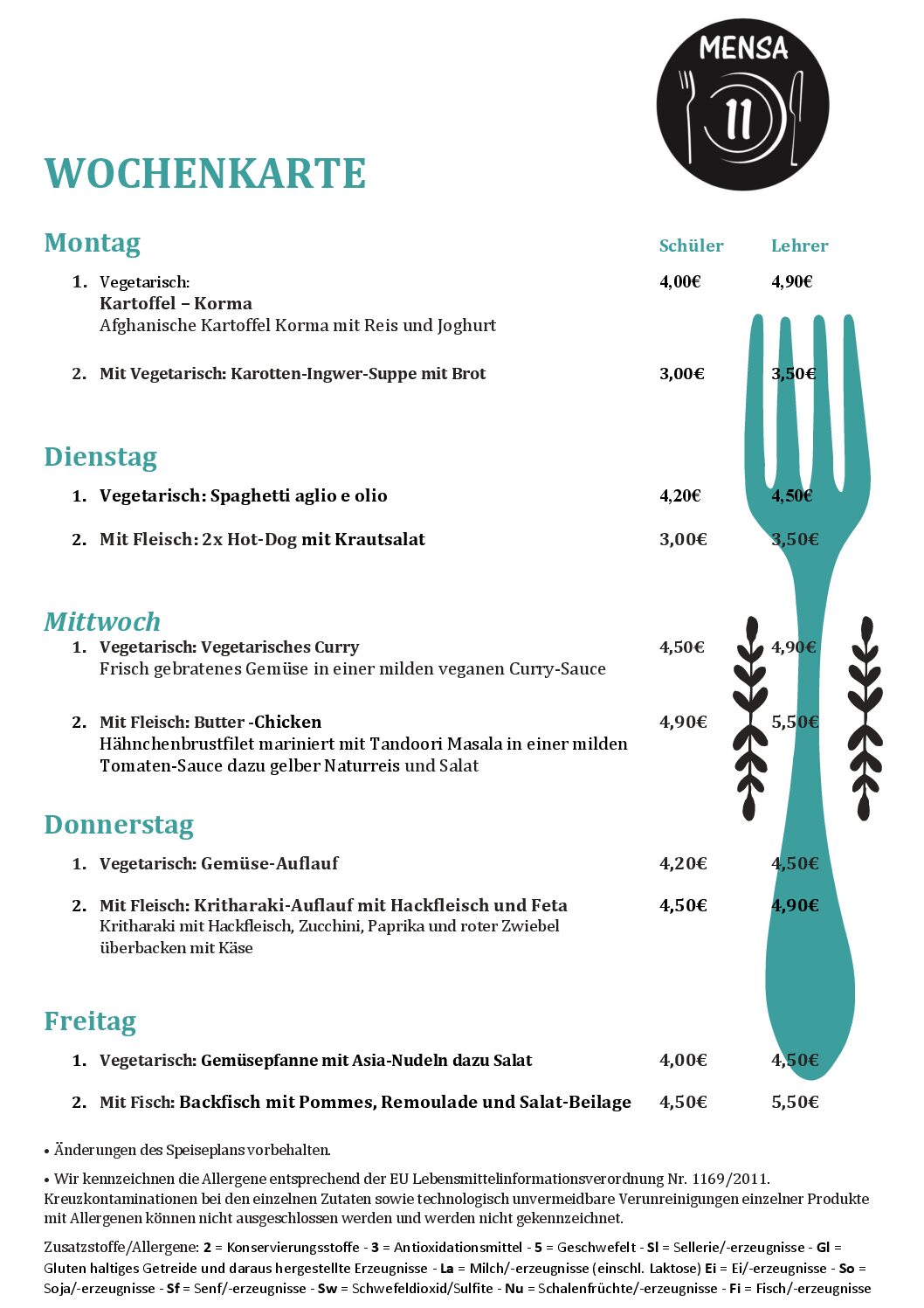 2024 23. November 2021 Wochenkarte Mensa 11 Hunger!? Durst!? Die Mensa 11 freut sich auf einen Besuch. Öffnungszeiten: Montag bis Freitag von 07.30 bis 14.00 Uhr Guten Appetit.